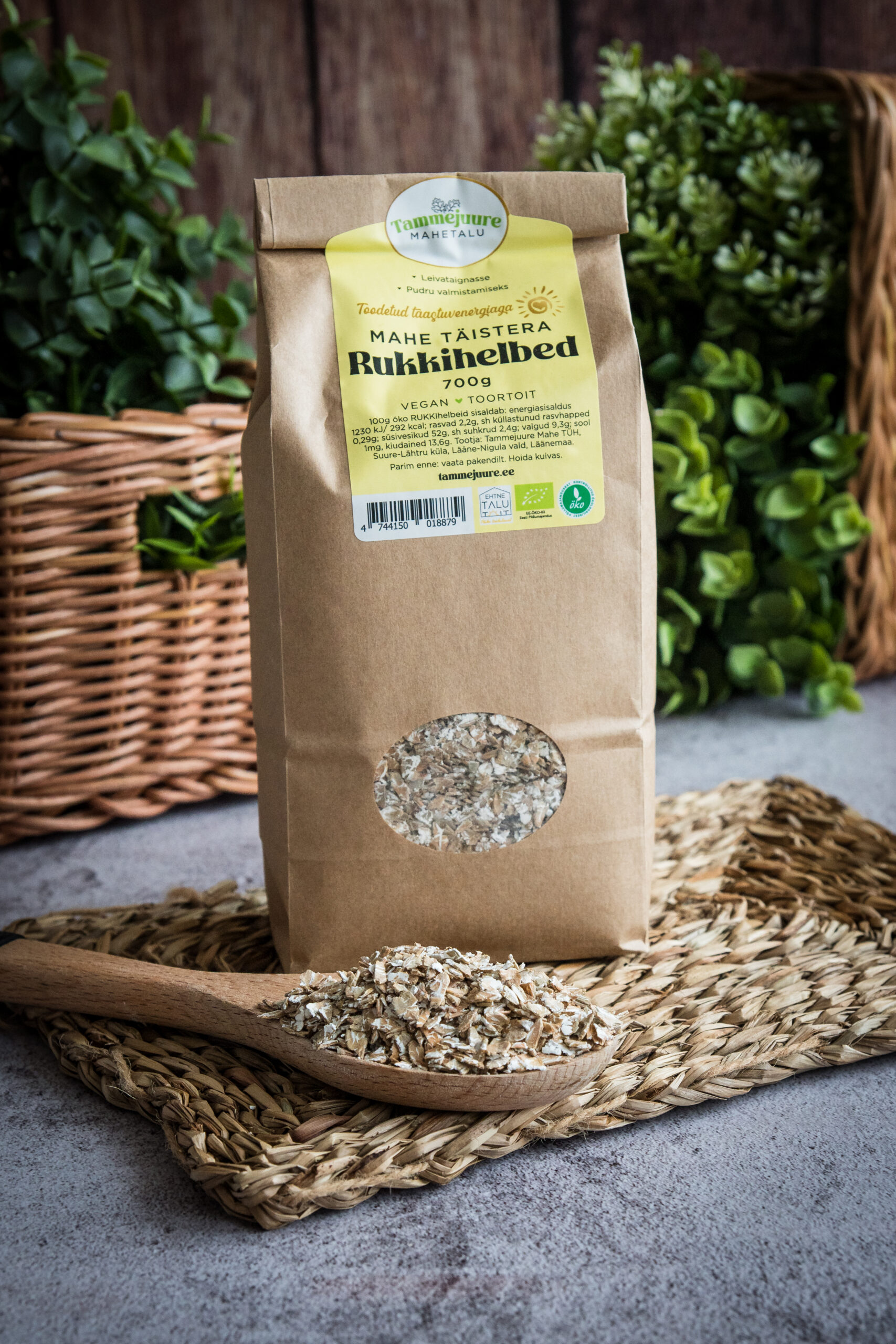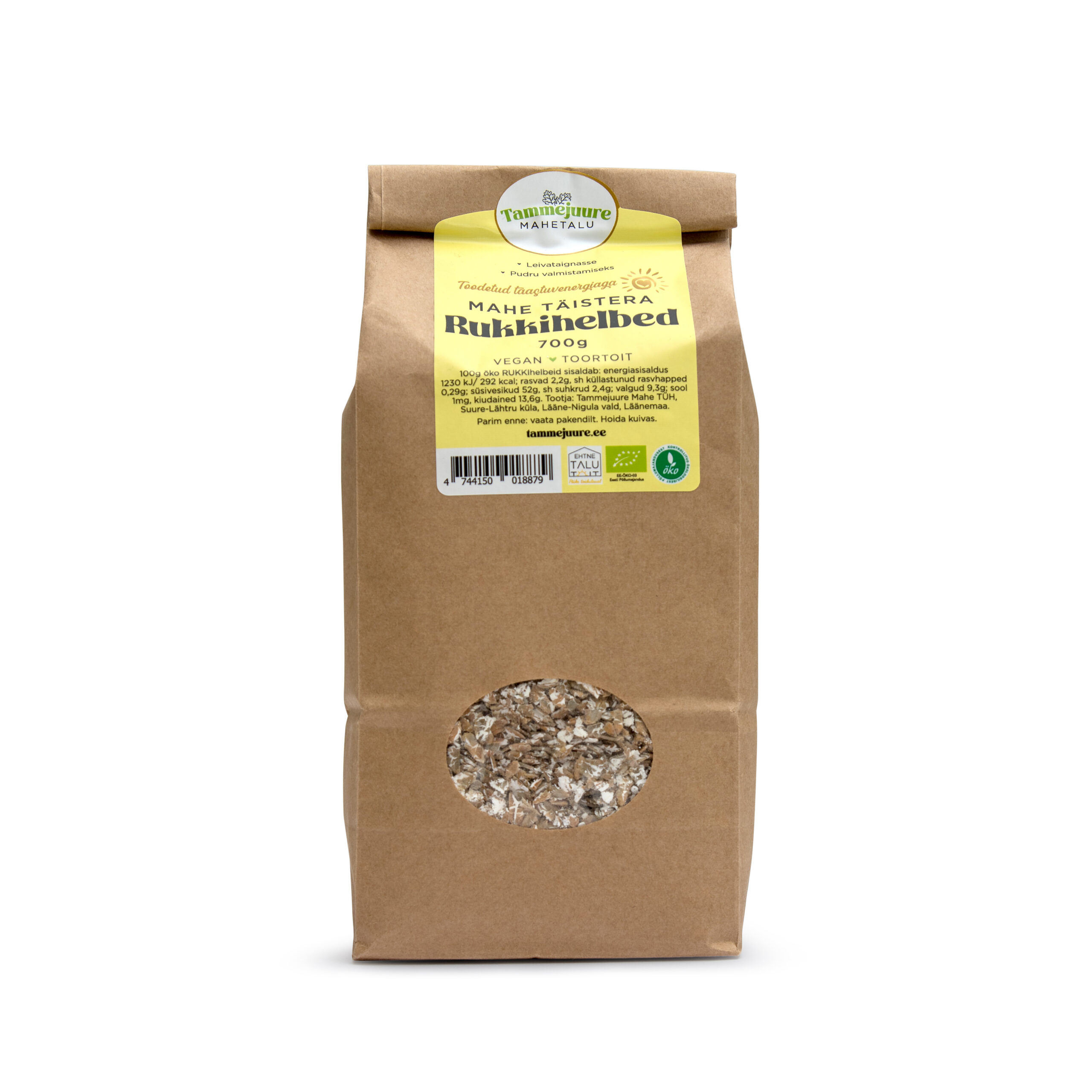 Koostis: 100% RUKKIhelbed. 100g öko rukkihelbeid sisaldab: energiasisaldus 1230 kJ/ 292 kcal; rasvad 2,2g, sh küllastunud rasvhapped 0,29g; süsivesikud 52g, sh suhkrud 2,4g; kiudained 13,6g, valgud 9,3g; sool 0,001g